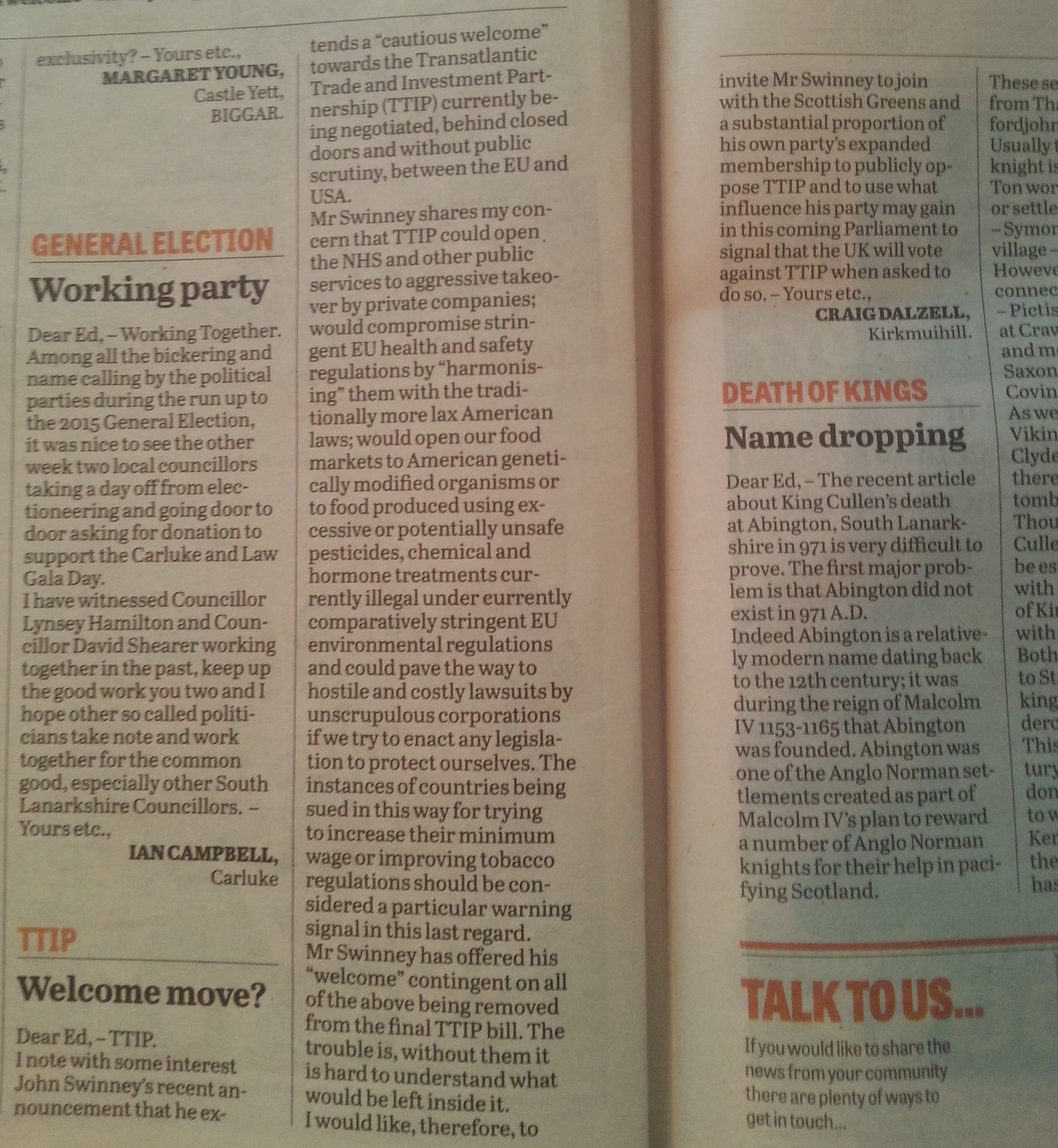 My letter to the Carluke and Lanark Gazette, printed on Wednesday 6th May, 2015.