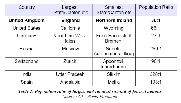 As I noted in the submission to the Smith Commission I wrote for Yes Clydesdale, the fact that England is so much larger than the other nations of the UK is absolutely no barrier to a federal like structure. Many countries around the world deal quite adequately with far larger population differentials and some, like Spain and Russia, are even comfortable with a certain degree of differential in what kind of power and how much of it is devolved to each sub-state.