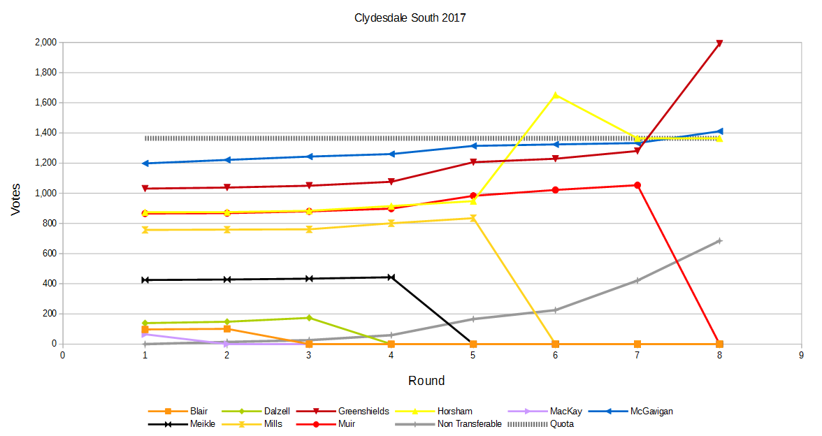 This redistribution isn’t sufficient to push anyone else over the line so Labour’s Gordon Muir was eliminated and his votes distributed mostly to the remaining Labour candidate George Greenshields. These transfers were enough to push both Greenshields and the Tory candidate Colin McGavigan over the quota line (although McGavigan would have been elected as final remaining member even if he hadn’t made the quota) which leaves the final results as 1 SNP, 1 Labour and 1 Conservative.