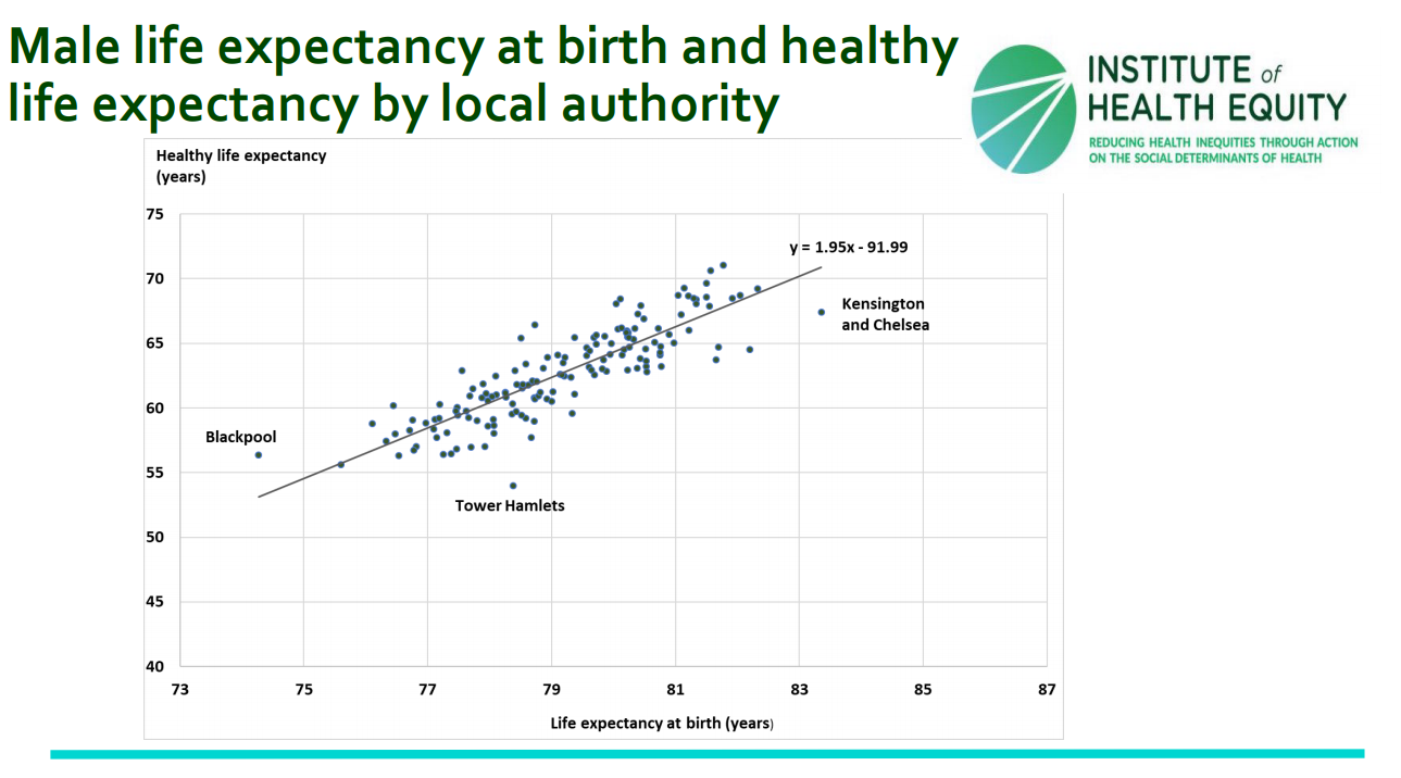 The Marmot report also highlighted something which isn’t talked about enough within this topic. The issue of healthy life expectancy. Our average person in Blackpool might live to 74 but they can only expect to reach 57 with a fair degree of health.
